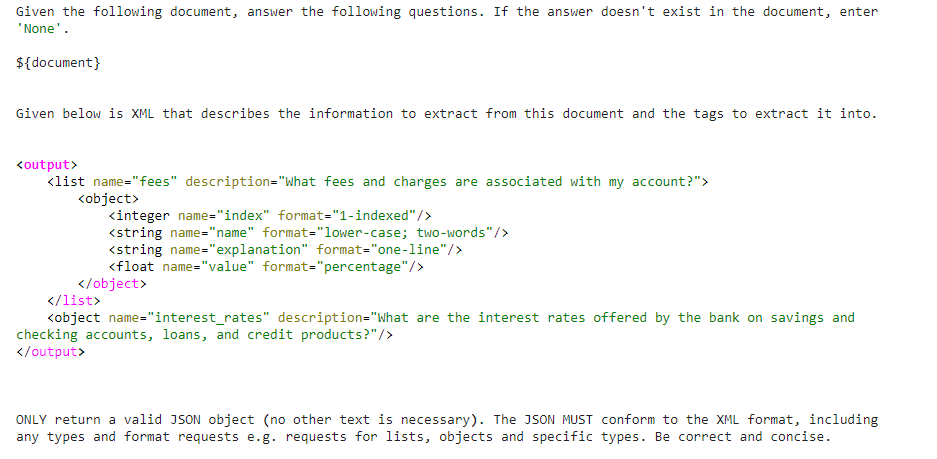 The variable $(document) will be replaced by the document you want the AI engine to parse when we make the call to OpenAI below. You'll notice that Guardrails has replaced the placeholders for the output schema with a well-formatted XML document. Each return property of the XML contains a format field that specifies the expected format of that piece of data.