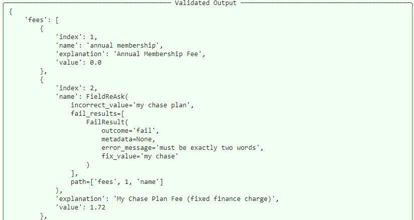 As its final output, Guardrails returns the corrected response that conforms to the model semantics we supplied.