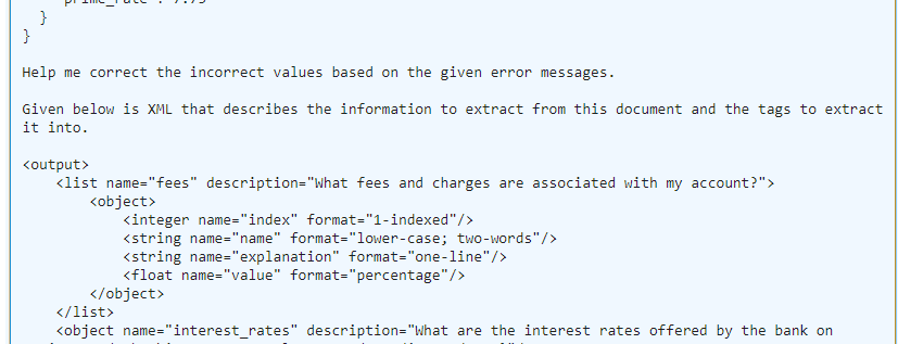 from guardrails.validators import LowerCase, TwoWords, OneLine from pydantic import BaseModel, Field from typing import List prompt = """ Given the following document, answer the following questions. If the answer doesn't exist in the document, enter 'None'. ${document} ${gr.xml_prefix_prompt} ${output_schema} ${gr.json_suffix_prompt_v2_wo_none}""" class Fee(BaseModel): index: int = Field(validators=[("1-indexed", "noop")]) name: str = Field(validators=[LowerCase(on_fail="fix"), TwoWords(on_fail="reask")]) explanation: str = Field(validators=[OneLine()]) value: float = Field(validators=[("percentage", "noop")]) class CreditCardAgreement(BaseModel): fees: List[Fee] = Field(description="What fees and charges are associated with my account?") interest_rates: dict = Field(description="What are the interest rates offered by the bank on savings and checking accounts, loans, and credit products?")