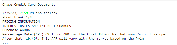 Finally, save the sample Chase credit card agreement to the local location data/chase_card_agreement.pdf. (This location is relative to the directory from which you will run your script or from which you started Jupyter.) This is a standard anonymous agreement that does not contain any personally identifiable information.