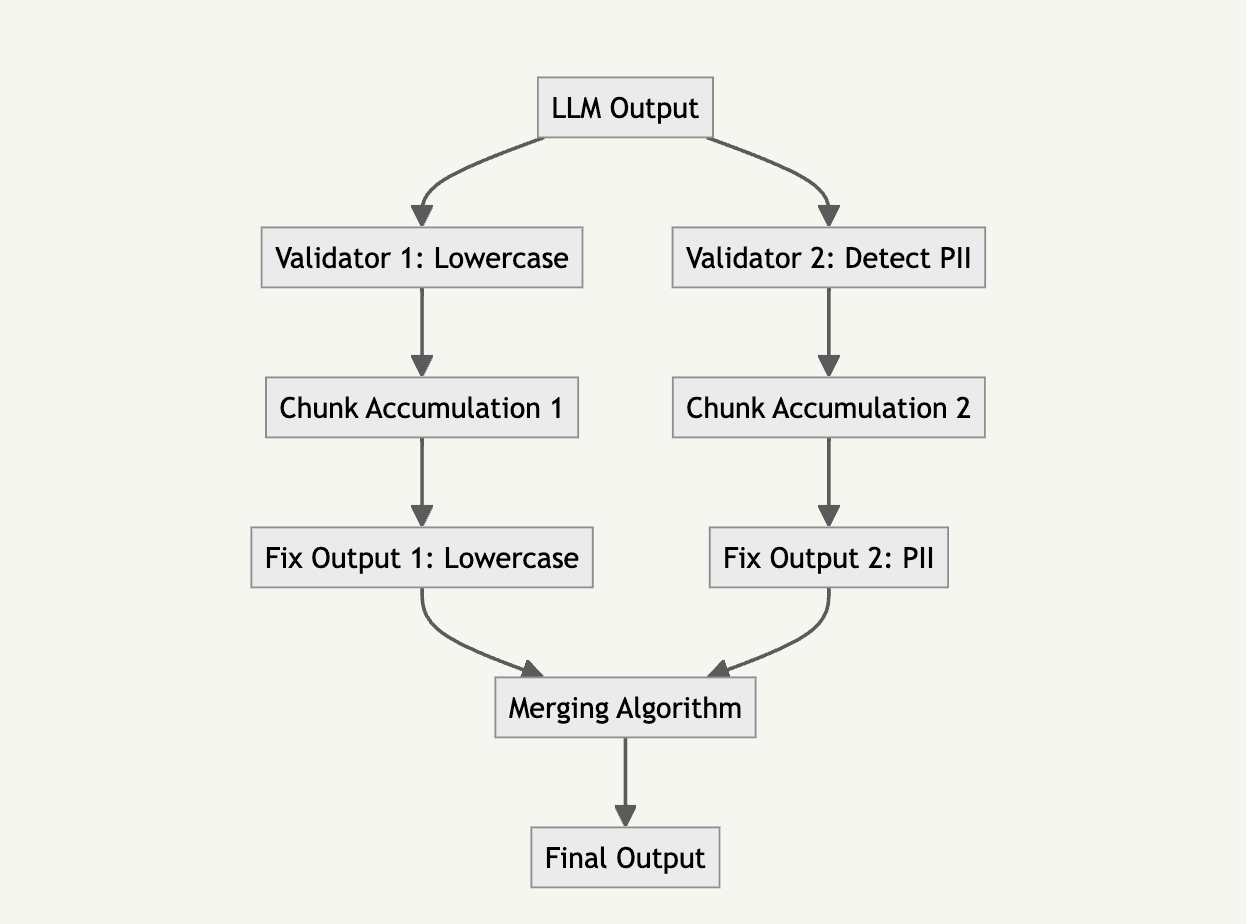 This diagram illustrates the process where the LLM output is processed by two validators—one for lowercase adjustments and one for PII detection. Each validator accumulates chunks independently and generates a fix output. The merging algorithm then combines these fixes into a final output.