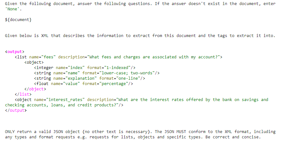 Let's step through how this works in practice. In our example, we'll build a simple Python application that extracts the key elements from a credit card service agreement. This includes the default interest rate, penalty rate, cash advance rate, balance transfer costs, foreign transaction fees, and other details.
