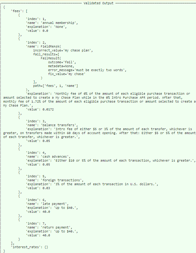 As its final output, Guardrails returns the corrected response that conforms to the model semantics we supplied.