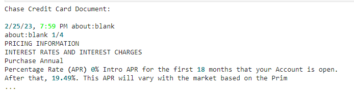 Finally, save the sample Chase credit card agreement to the local location data/chase_card_agreement.pdf. (This location is relative to the directory from which you will run your script or from which you started Jupyter.) This is a standard anonymous agreement that does not contain any personally identifiable information.